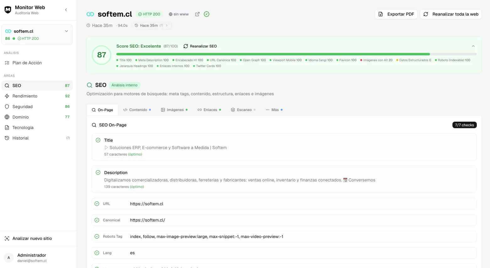 Analiza cualquier sitio web y descubre qué arreglar primero. SEO, rendimiento, seguridad, dominio y tecnología en un solo informe.